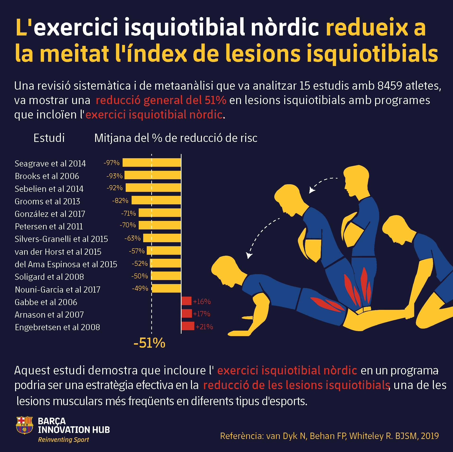 Recentment, un estudi (van Dyk, Behan, & Whiteley, 2019) publicat a la British Journal of Sports Medicine ha analitzat si incloure aquest exercici en un programa de prevenció disminueix realment l’índex de lesió als isquiosurals. Després d’avaluar 15 estudis, 8.459 esportistes i 525 lesions, l’anàlisi va mostrar que incloure l’NHE redueix fins a un 51% el risc de lesió.