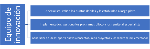 Esta estructura les permite a todas las partes interesadas comunicarse efectivamente y trabajar juntos con inteligencia y destreza. Si los especialistas estuvieran “sobrecargados” de innovación, simplemente ignorarían desafiar el statu quo. Si los implementadores tuvieran que proponer cada una de sus ideas, estarían agotados por la cantidad de ideas aportadas sobre la mesa. Y si los generadores de ideas realmente tuvieran que implementar todas las “wild ideas”, entonces nunca nada se haría bien.